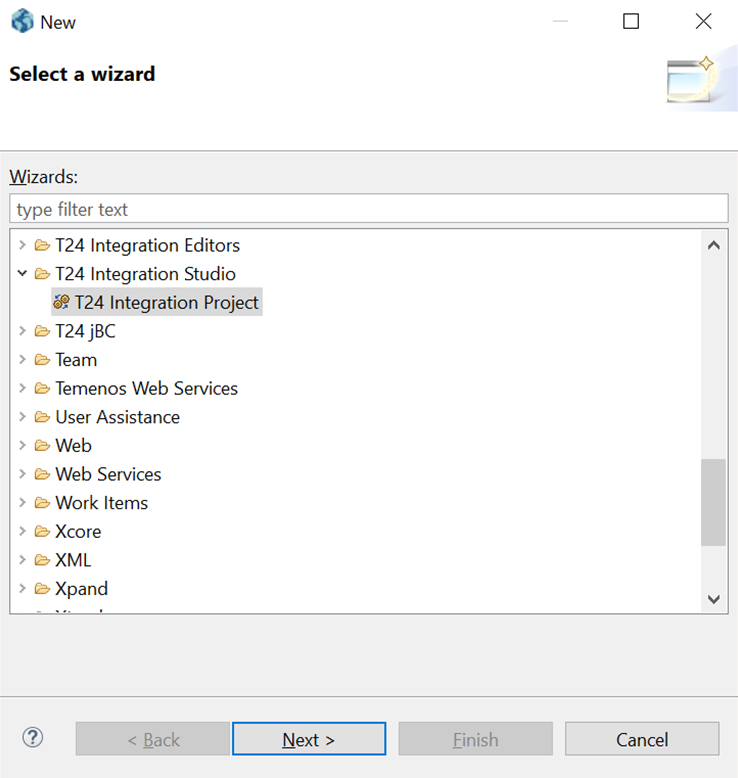 - Create a new project using the Transact Integration project: In the top navigation menu, click File > New > Project. The initial page of the wizard is displayed.