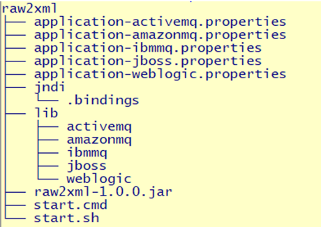 • Specific application.properties and jar files for the following five JMS providers: JBoss, ActiveMQ, AmazonMQ, IBM MQ and WebLogic.