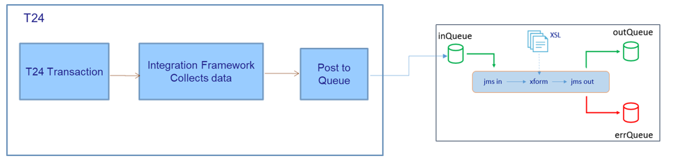 When a transaction is initiated, the raw Transact message is written to the queue. A raw to XML transformer reads the raw message in the input queue and writes the transformed message to the output queue. This transformer capability is provided through a standalone component. If an error occurs, the original raw format message, along with the exception stack, is saved in the error queue.