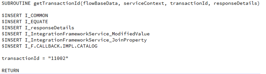 The name of the implementing jBC subroutine must be T24IntegrationFrameworkServiceImpl.getTransactionId with the following parameters: