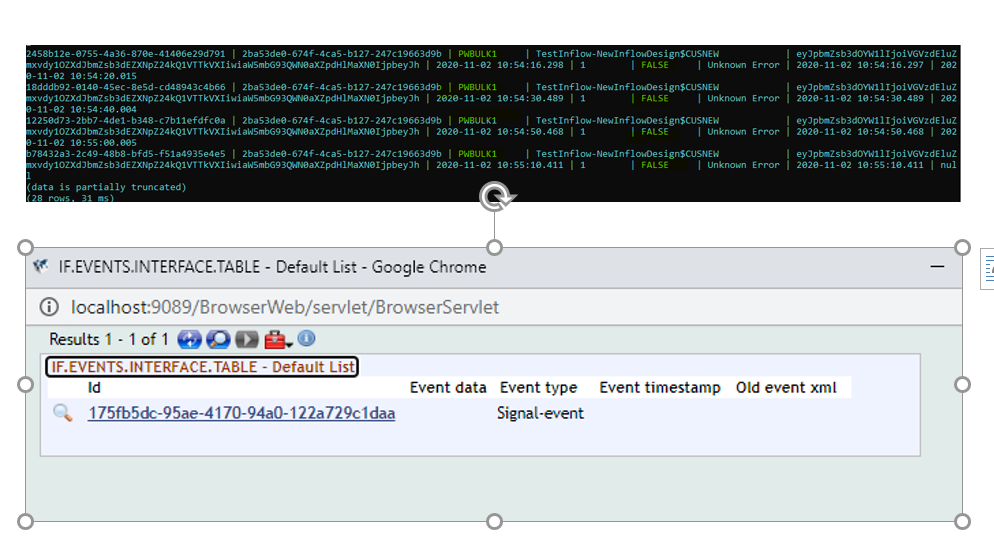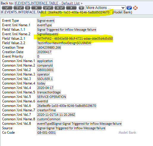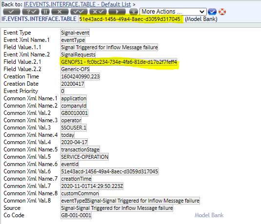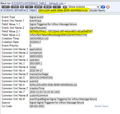 As a result of executing the above request, it fails due to an invalid sector and moves to IF_INFLOW_MESSAGE_FAILED. When all the retries are exhausted, then a signal event triggers and displays it in IF.EVENTS.INTERFACE.TABLE.