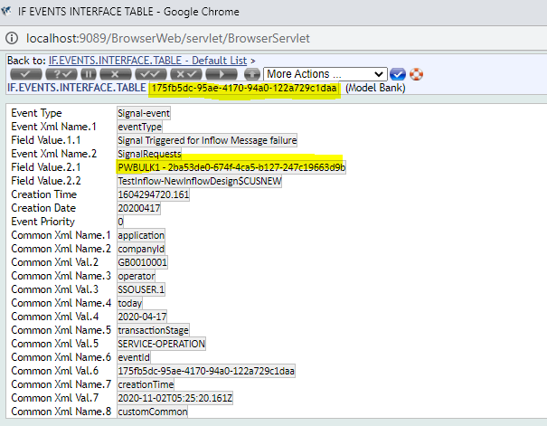 As a result of executing the above request, it fails due to an invalid sector and moves to IF_INFLOW_MESSAGE_FAILED. When all the retries are exhausted, then a signal event triggers and displays in IF.EVENTS.INTERFACE.TABLE.