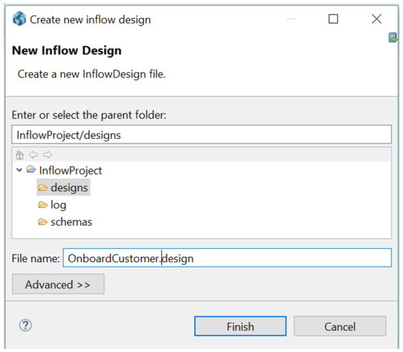 - Enter a name for the Inflow and select Finish the open the Designer.
