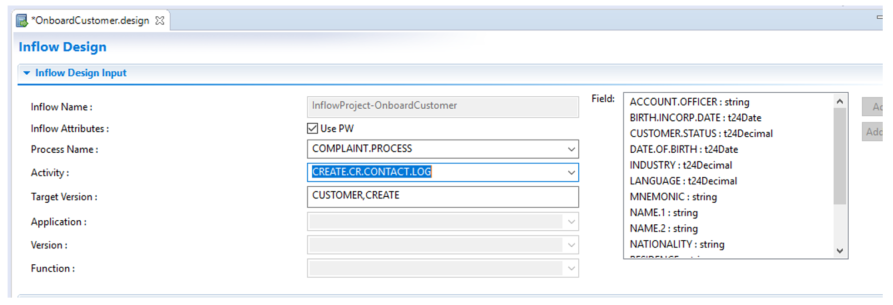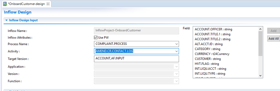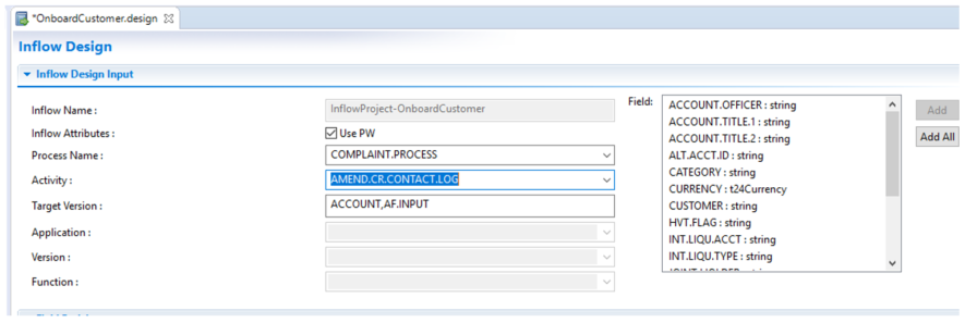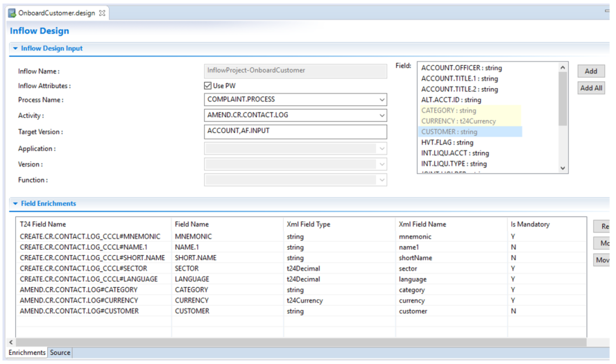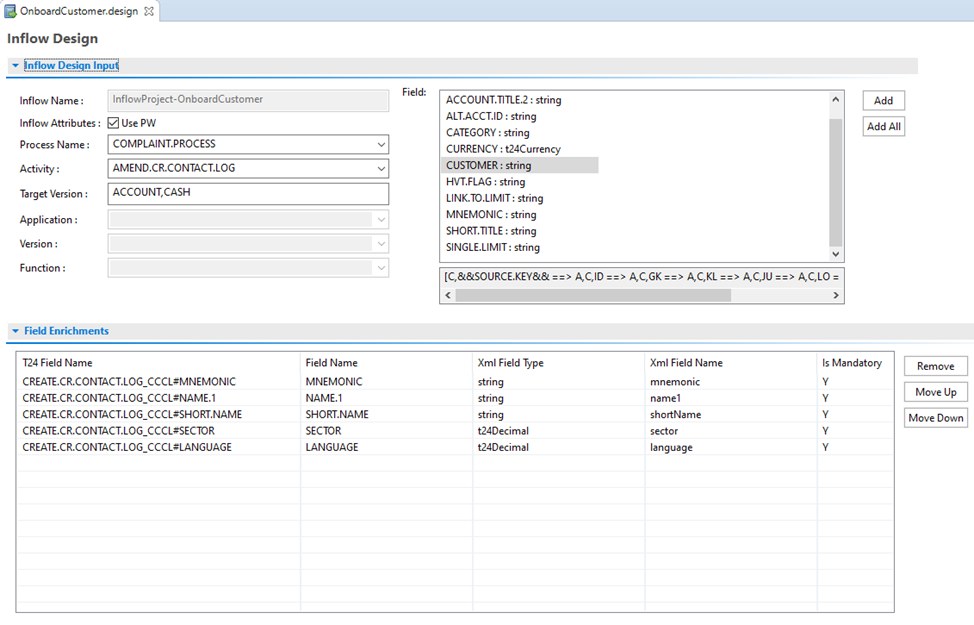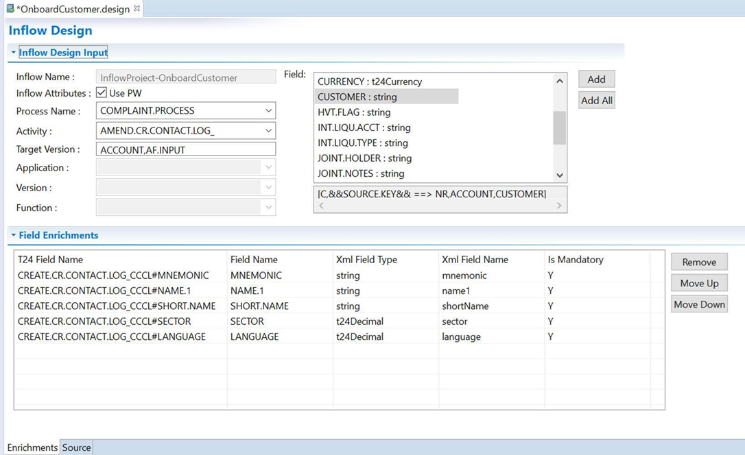 When a field is selected from the fields list, a read-only text box below Field table will show any enrichment (or mapping) defined for the field. To understand the mapping definition, see the Process Orchestration user guide. For example the above screenshot shows the mapping as C,&&SOURCE.KEY&& ==> NR,ACCOUNT,CUSTOMER. This means that the @ID of CUSTOMER is to be mapped to the CUSTOMER field of ACCOUNT. This example does not have any conversion.