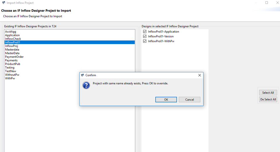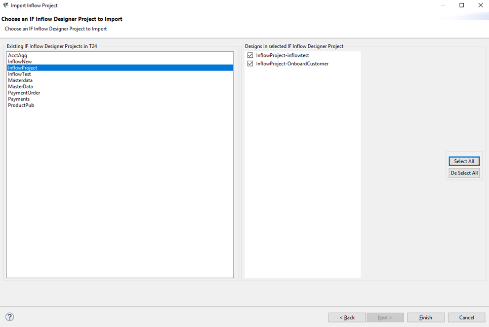 - Under the Import Integration Project category in the Import menu, click Import Existing Inflow Designs From T24.