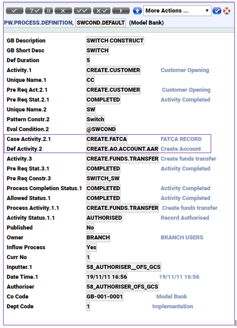 The first activity is CREATE.CUSTOMER and the completion of that activity will check a certain condition defined in SWCOND (Where we check the customer residence). Based on the condition, the case activity CREATE.FATCA may or may not execute. If the condition for the CASE activity does not suffice, then the default activity will execute.