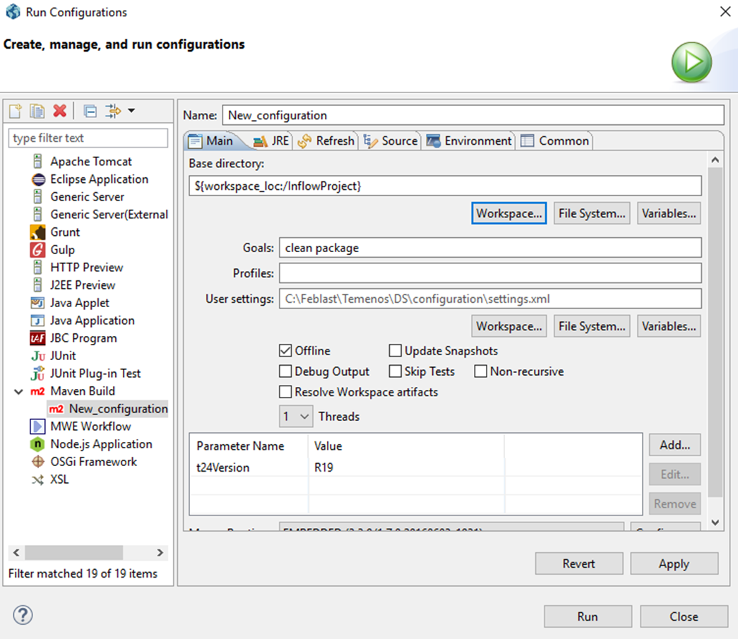 - In the pop-up window, click Maven Build and create a new Maven build configuration for this project. Ensure that the Goal is set to clean package, and Parameter Name is set to t24Version. Value can be any version number (for example R19) as shown below.