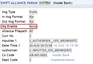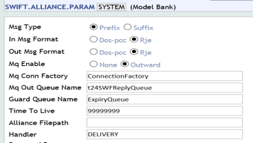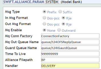 You need to set the MQ Enable field to Outward for processing respective Swift messages. The Handler field holds the activation string, which has to be passed as a parameter to the CALLJEE and is used in TAFC runtime. Ensure a valid setup in the SWIFT.ALLIANCE.PARAM parameter table for Inward or Outward processing of Swift messages.
