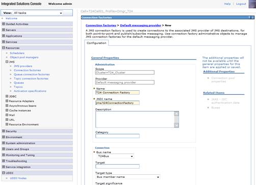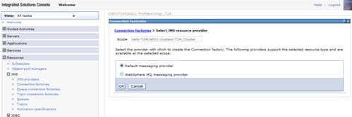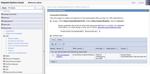 - In the WebSphere admin console, click Resources > JMS > Connection factories > Scope > Server > New.