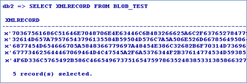 If the XMLRECORD is of XML type, the data will be converted from the internal dynamic array format into an XML sequence for insertion into the DB2 database. If the record is of BLOB type, the data will be stored directly in the XMLRECORD column in binary format.