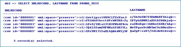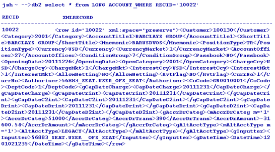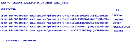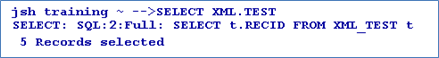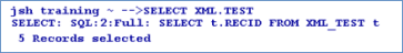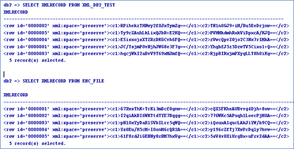 SELECT: SQL:1:Part: SELECT t.RECID,t.XMLRECORD.getClobVal() FROM DB2_EXTDICT t WHERE xmlexists('$xmlrecvar/row[c2/text()>="100"]' PASSING XMLRECORD AS "xmlrecvar") |
