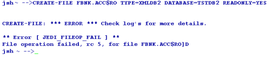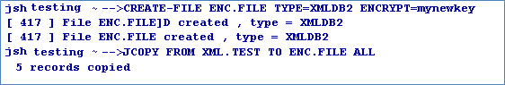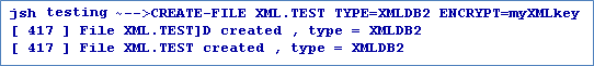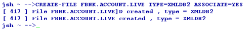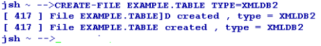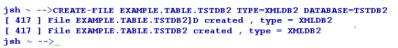 jsh-->CREATE-FILE DB2_EXTDICT TYPE=XMLDB2 [ 417 ] File DB2_EXTDICT]D created , type = XMLDB2 [ 417 ] File DB2_EXTDICT created , type = XMLDB2