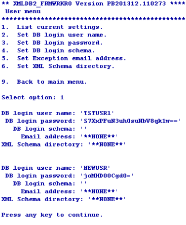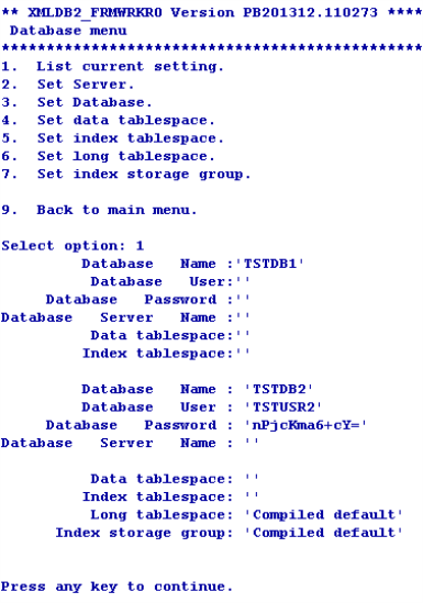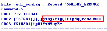 The jedi_config file will have the XMLDB2_FRMWRK record with the details of the server, database, user credentials and base key in encrypted form.