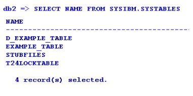 jsh -->SELECT DB2_EXTDICT WITH ATTR2 EQ '100' |