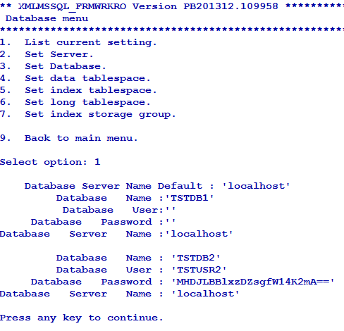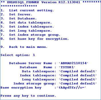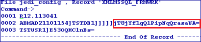 The jedi_config file will have the XMLMSSQL_FRMWRK record with the details of the server, database, user credentials and base key in encrypted form.