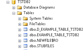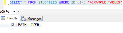For each table a cross reference entry is created in the STUBFILES table with the MSSQL server RDBMS database. In addition, a native file stub is also created for each table in the specified file path (in the above example, it is the current directory). The stub files are used to locate and invoke the correct driver for the corresponding table.