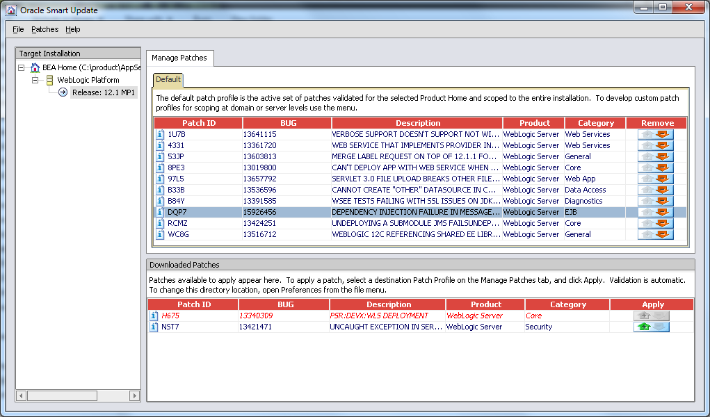 In the Smart Update window, you can view the DQP7 DEPENDENCY INJECTION FAILURE IN MESSAGE DRIVEN BEAN patch in the Downloaded Patches section. You need to apply this patch by clicking on the green arrow Apply. After a few seconds, you will see your patch applied. You are now ready to deploy TAFJ.