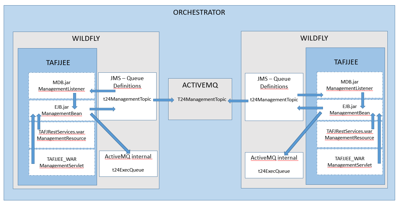 The ManagementListener receives messages posted to the topic and delegates the corresponding management activities to the management EJB on each instance. For example, in case of START.TSM message, the management EJB on each instance sends a START.TSM message to the local t24ExecQueue.
