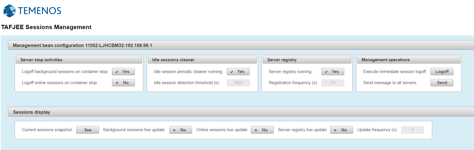 The Sessions display panel relates to the management servlet behaviour and not Management Bean configuration. It displays either the sessions running on the local host (snapshot or live update) or the server registry status (live update). The live update options depend on Update frequency(s) parameter value, which polls session information periodically. The live update options are disabled by default and can be started upon confirmation with the specified refresh frequency.