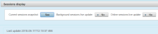 The Current sessions snapshot:, Background sessions live update: and Online sessions live update: options are related to the local host only and the management service will be triggered to retrieve session information from the JMX MBean server.It could be a simple snapshot for all online and background session or a periodic snapshot for background and/or online session, depending on the option selected.