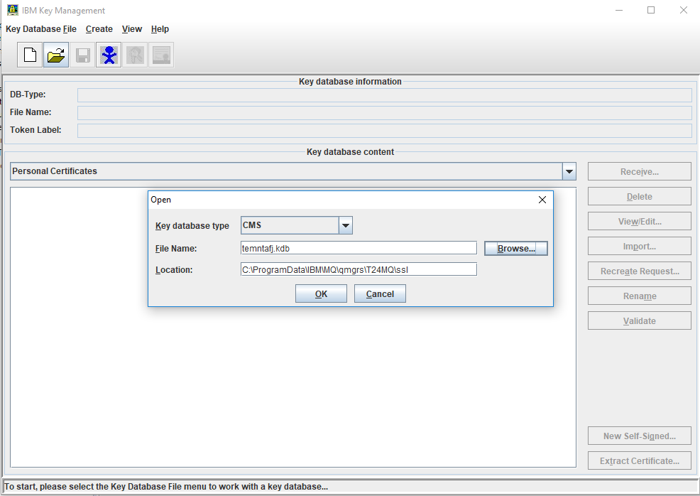 - Set the Key database type to CMS, enter the File Name: and Location: in the Open prompt and click OK.