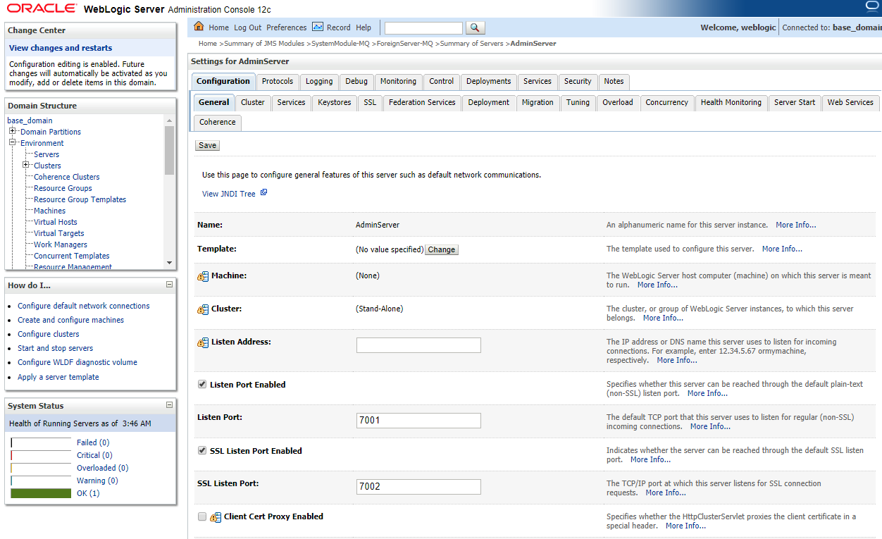 - Select Environment > Servers > Adminserver from the home page.