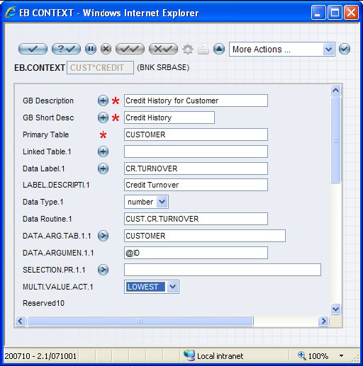 Creating rule context is the first step when you design a business rule. Rule context are defined (one time definition) in the Temenos Transact application EB.CONTEXT. From a designer perspective, contexts are Temenos Transact applications or field names used in a rule definition.