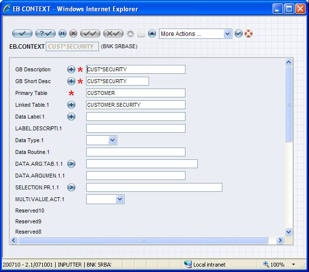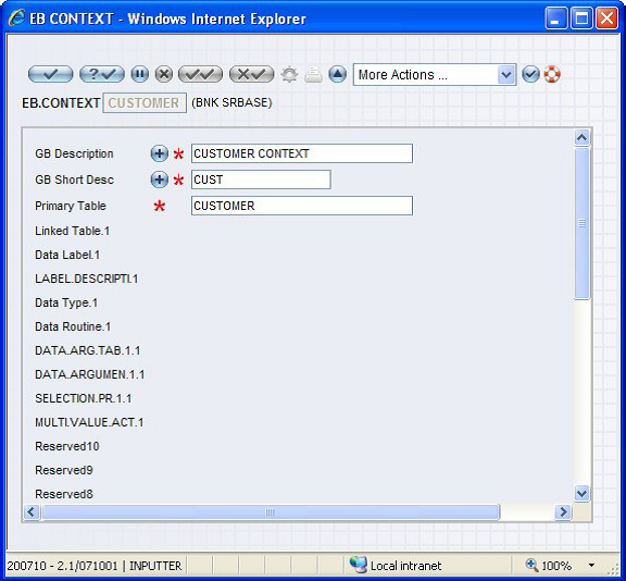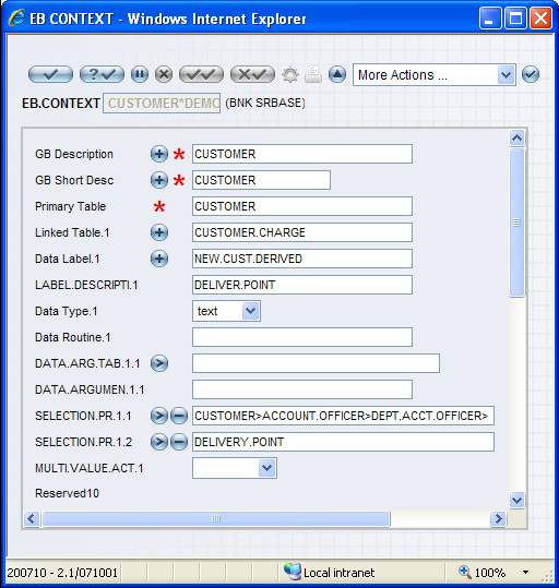 When the details in a single table is insufficient to evaluate the rules, you need to use a complex EB.CONTEXT. The ID of any complex contexts should have a delimiter ‘*’. For example CUSTOMER*COMPLEX. There are two types of complex contexts: