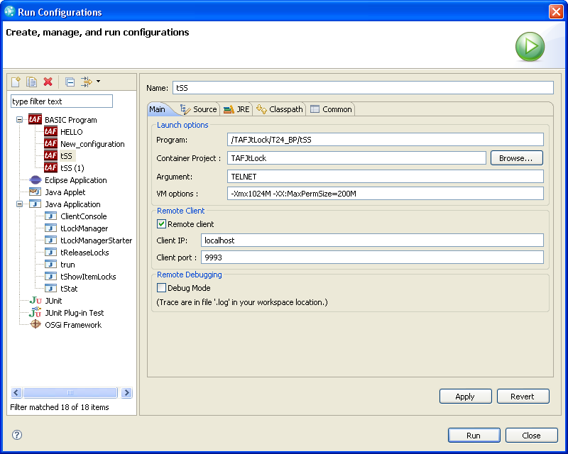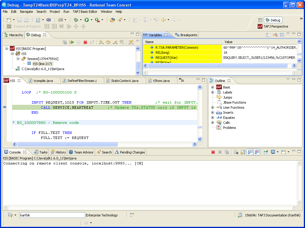 tClientConsole is part of the TAFJ tools. For example, you can start a client console on port 9993 (default) and launch an application in Eclipse to redirect all IO in this console. This will allow you to debug Temenos Transact (from EX) in Eclipse. Client console also gives you the ability to debug tSS in Eclipse. For more information, see Launching the Program.