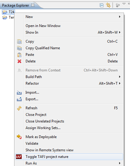 - Right-click the project and click Toggle TAFJ project nature.
