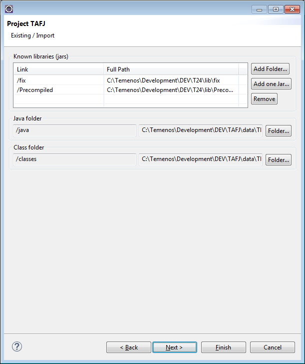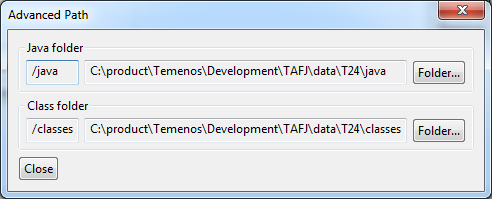 - Click Folder... to specify the Java and Class directories.NOTE: The Java and Class folders are automatically set and created inside the <TAFJ_HOME>/data/<PROJECT_NAME>/. You should not set the classes folder of the TAFJ project with the output folder of the Java project. In that case, the compilation process will not delete the generated Java files and the compilation time will increase according to the number of Java files.