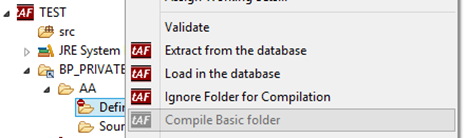 If a folder is marked as ignored, then Eclipse or EDS will not pass it to the TAFJ compiler and all files in the folder will be ignored. For example, based on the above screen capture, if you try to compile the AA folder, then files available in Sources will be compiled, while the files available in Definition will be ignored (even if there are jBC files).
