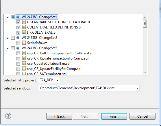 - Select the change set you want to install and the related TAFJ project and sandbox.NOTE: There is only one TAFJ project and by default, the appropriate sandbox is selected.