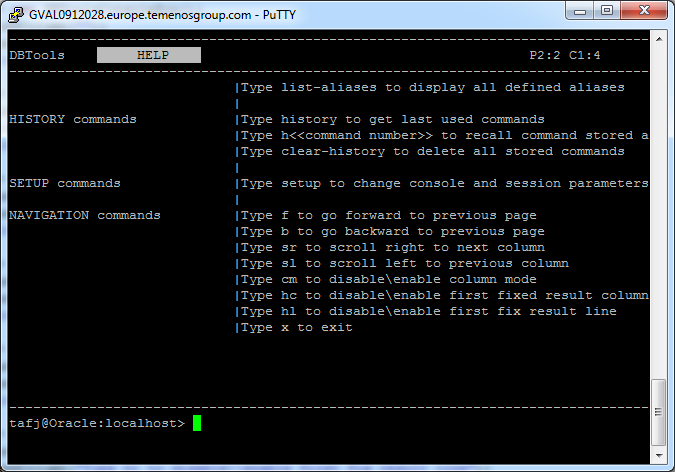 When opening DBTools console, the HELP command is launched by default and the available commands are displayed on the main panel.
