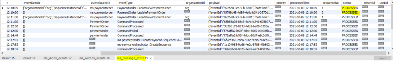 - Once the command or event is processed successfully in event store microservice, it inserts records in the ms_message_store table.