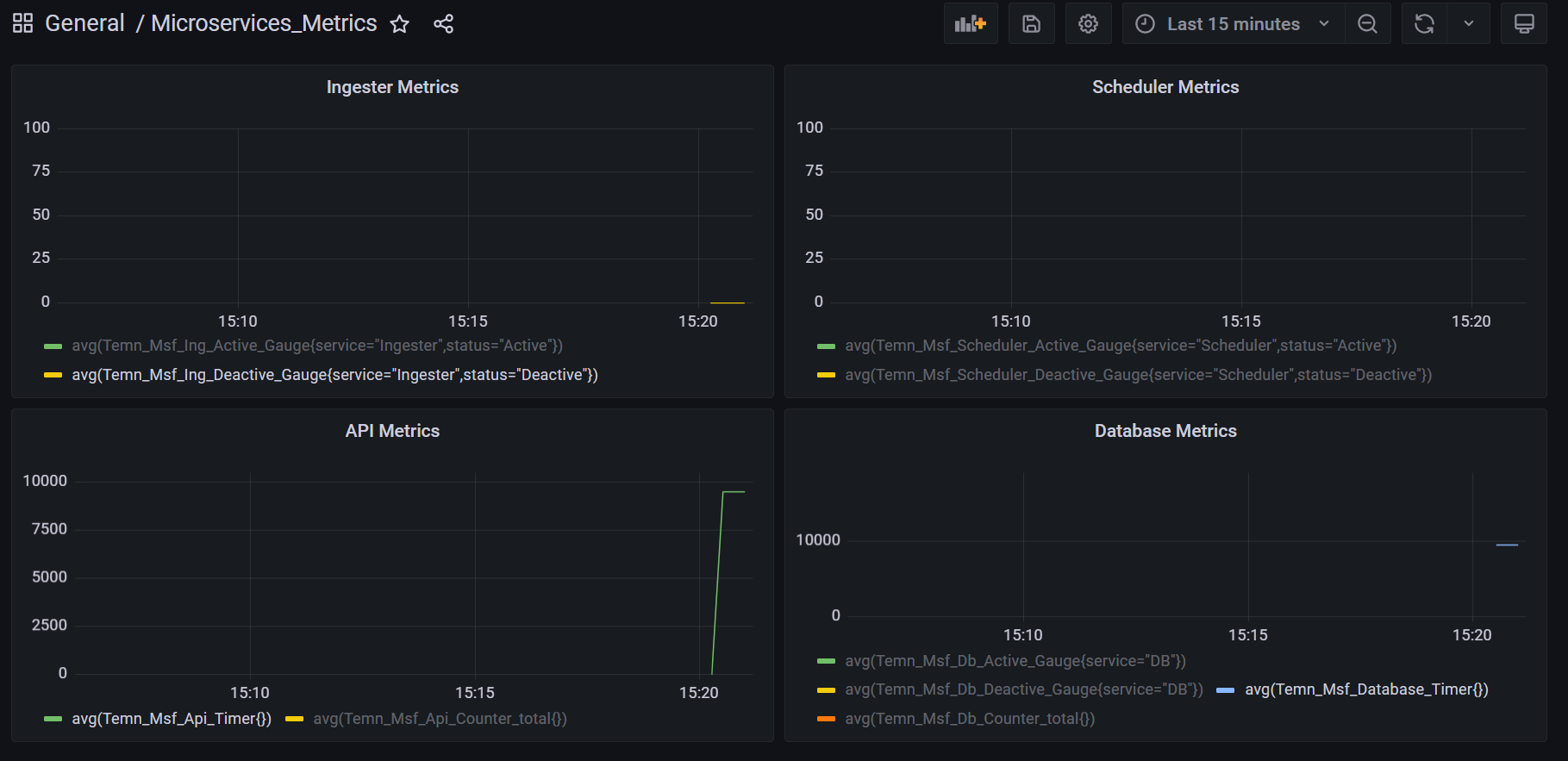 All kinds of Microservices consist of API, INGESTER, Scheduler and DB services. Separate metrics are added to each service.