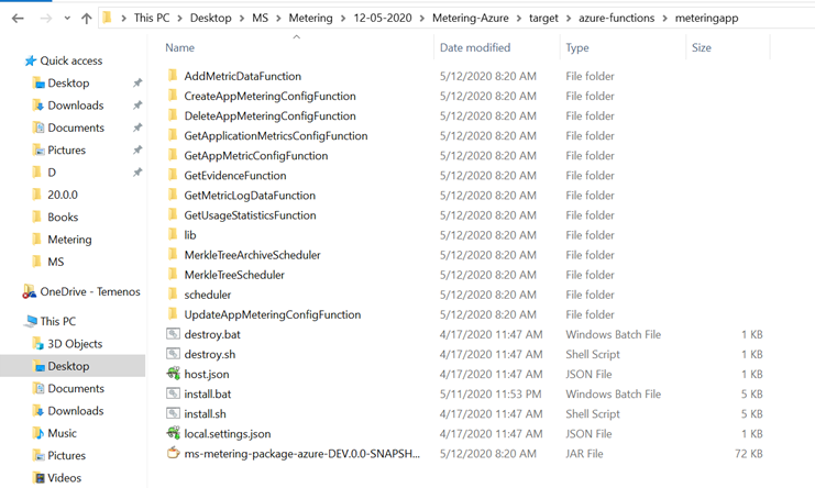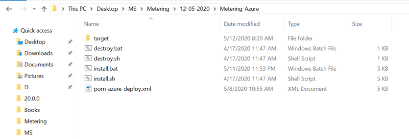 This section shows the folder structure of Metering package. Holding Microservices for Azure deployment is available as a single release bundle (For example, ms-metering-package-azure-DEV.0.0-SNAPSHOT.zip). It contains the ms-metering-package-azure-DEV.0.0-SNAPSHOT.jar file and installation related files.