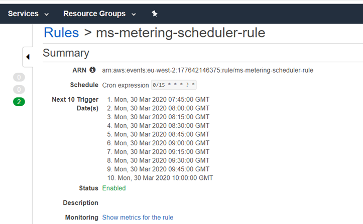 - In the Cloud Watch rule, choose ms-metering-scheduler-rule and you can modify the trigger time for the metering scheduler.