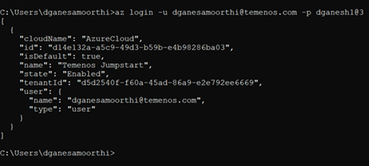 C:\>az login -u user@temenos.com -p XXXXX