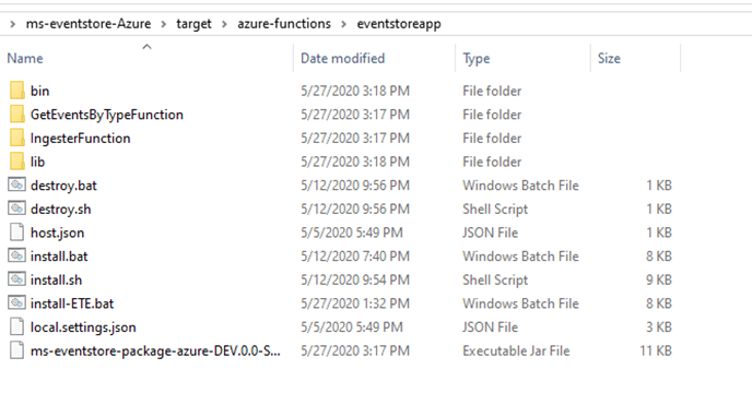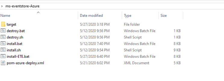 This section shows the folder structure of Event Store package. Holding Microservices for Azure deployment is available as a single release bundle (For example, ms-eventstore-package-azure-DEV.0.0-SNAPSHOT.zip). It contains the ms-eventstore-package-azure-DEV.0.0-SNAPSHOT.jar file and the installation related files.