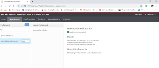 Deploy Ear- Place the shared ear (traceability-mdb.ear.ear) in the <%JBOSS_HOME%>/standalone/deployments path.